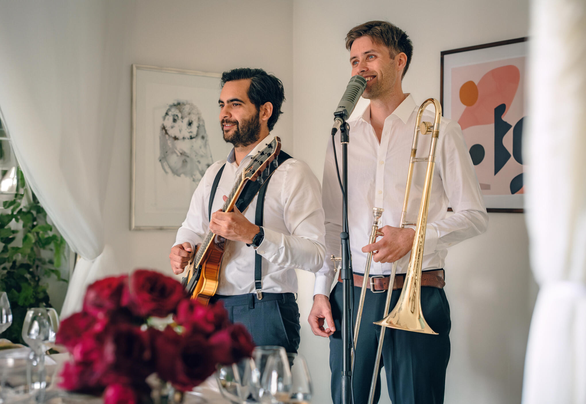 Swing&Bossa Duo – Johannes Solvang og Jacob Holthe Thorsen leverer stemningsfull jazz for enhver anledning.Med regelmessige opptredener på steder som Grand Hotel, Grand Café og Himkok, samt private eventer og bryllup, skaper duoen en sofistikert atmosfære med en blanding av swing og bossa nova. Deres fleksible repertoar passer til alt fra konserter til bakgrunnsmusikk for aperitivo, mingling, vielse eller fest – den perfekte musikalske rammen som gir arrangementet det lille ekstra.